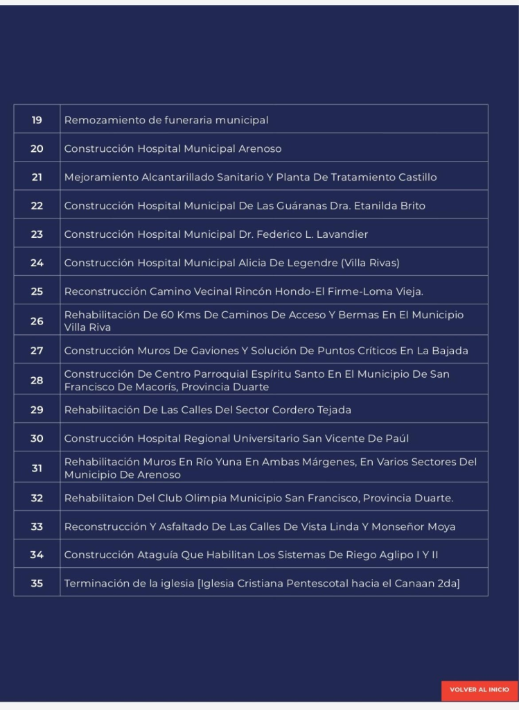 Entre las principales obras destaca el Hospital Regional Universitario Ángel María Gatón, junto a remozamientos hospitalarios municipales y ampliaciones de emergencias, garantizando atención médica especializada más cercana y reduciendo traslados hacia otras provincias.