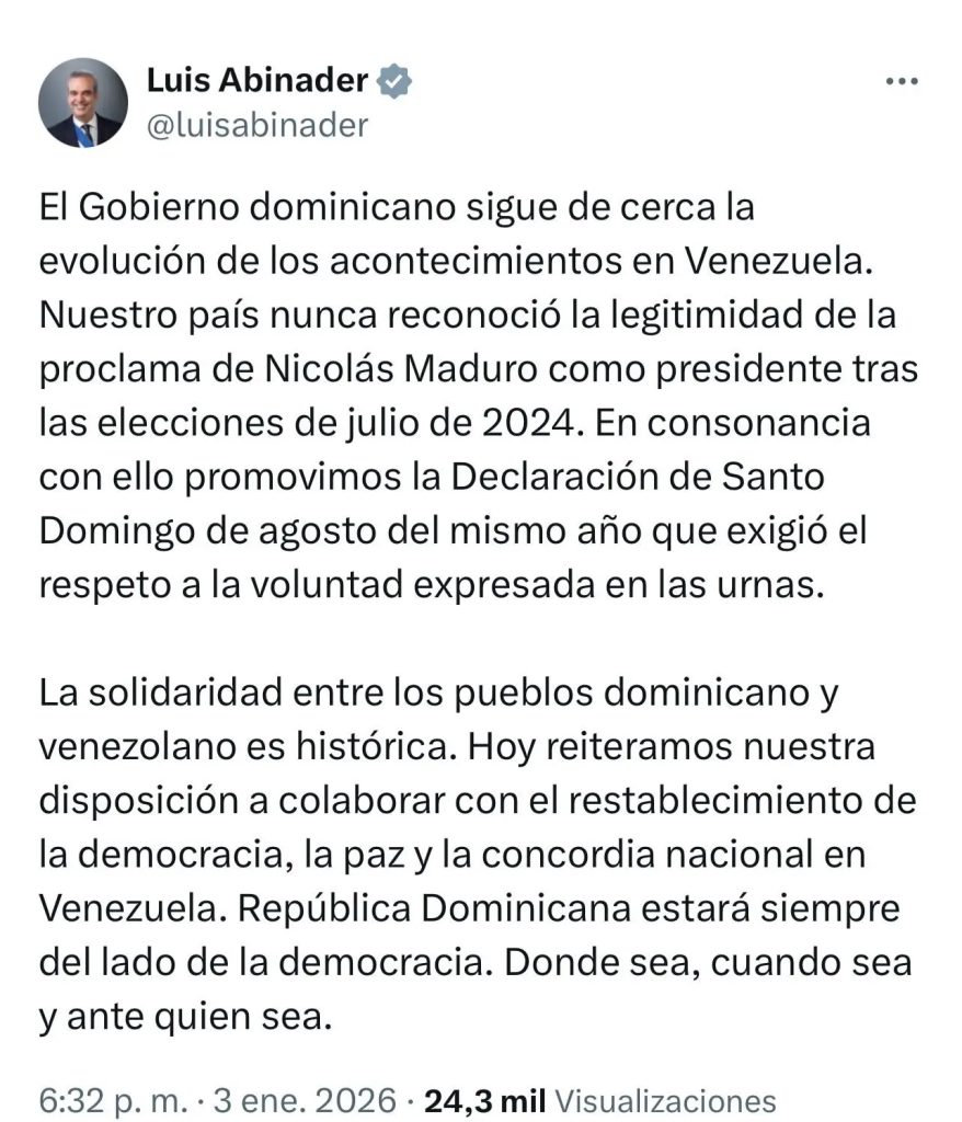 “El Gobierno dominicano sigue de cerca la evolución de los acontecimientos en Venezuela”, expresó Abinader, subrayando el compromiso del país con los principios democráticos y el respeto al sufragio como base de la legitimidad política.