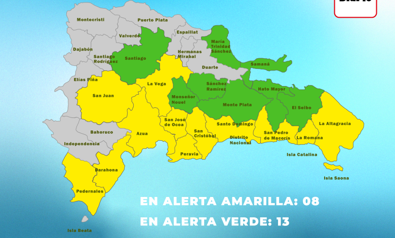 En ese sentido, el COE colocó en alerta amarilla a 13 provincias y el Distrito Nacional, y en verde a ocho por posibles crecidas de ríos, arroyos y cañadas, así como inundaciones repentinas o urbanas.