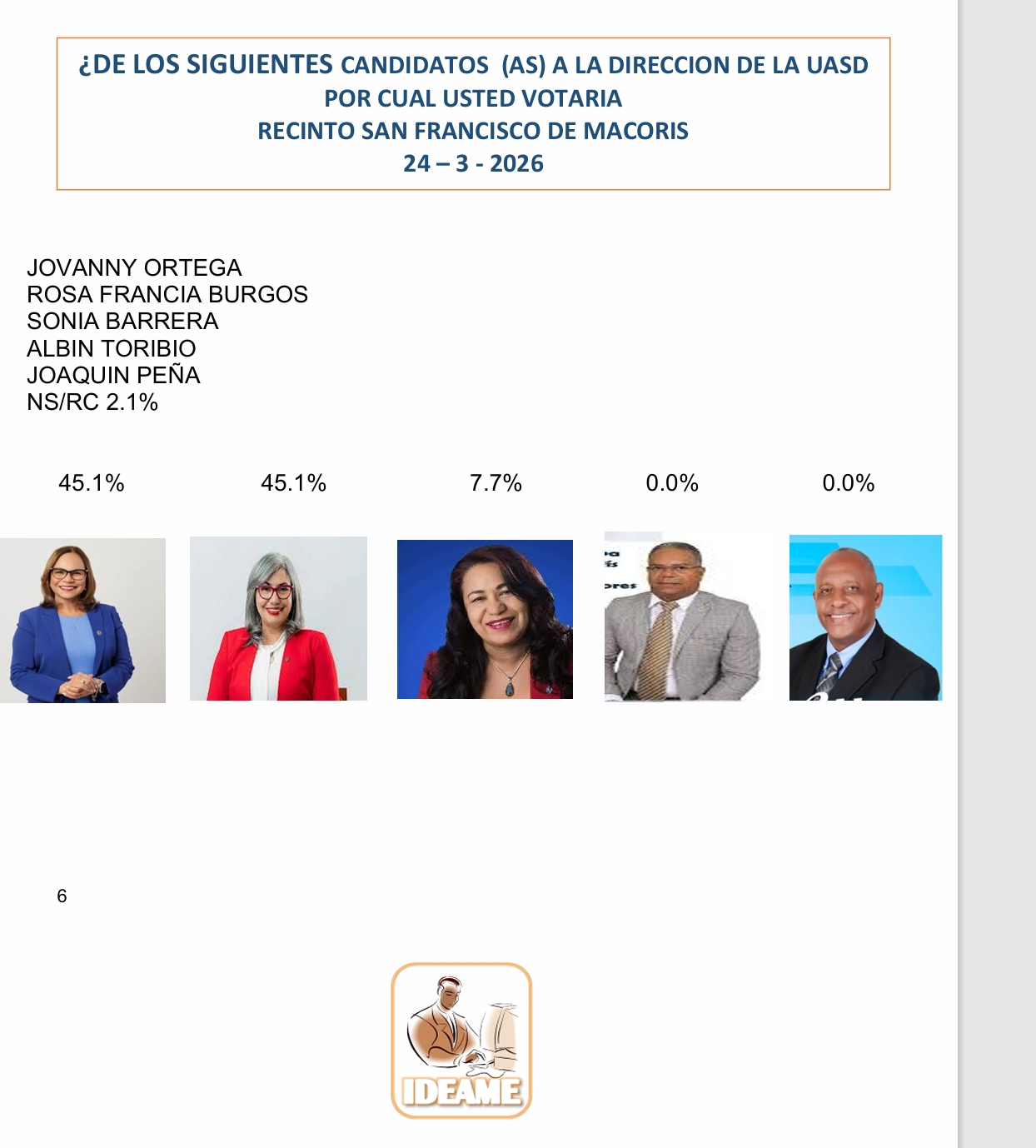 San Francisco de Macorís. – De acuerdo con los datos más recientes de la firma encuestadora Instituto Dominicano de Estudios Aplicados Mercadeo y Encuesta (IDEAME), el panorama electoral en el recinto de la UASD San Francisco de Macorís se presenta con una cerrada preferencia entre las principales aspirantes.