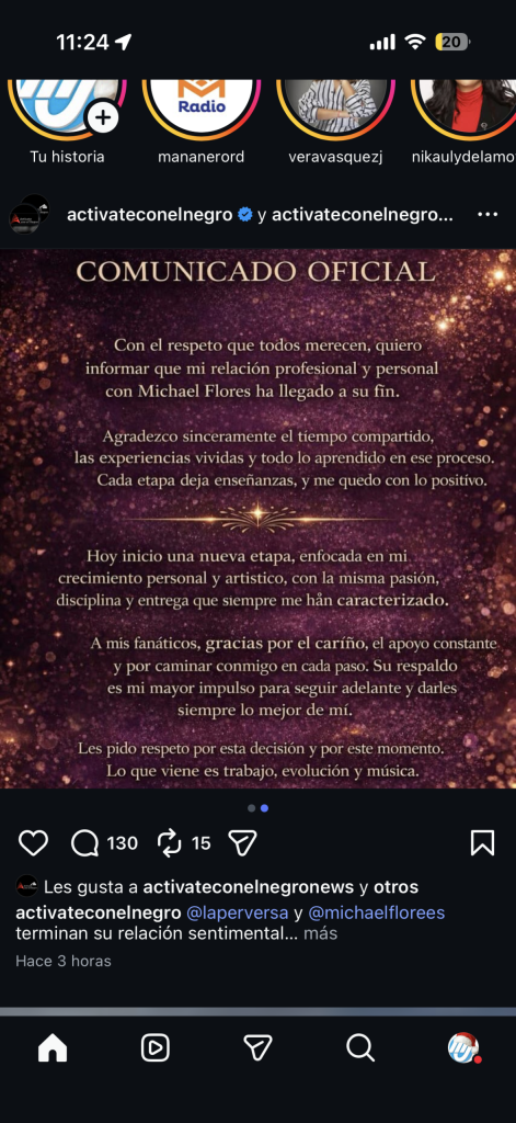 La información fue confirmada mediante un comunicado publicado en redes sociales, en el que la intérprete expresó que la decisión fue tomada con respeto, agradeciendo el tiempo compartido y las experiencias vividas durante su relación.